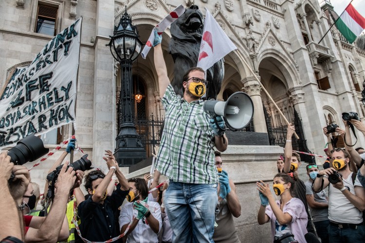 Ezen a képen láthatóan én vagyok, ahogy boldogan (bár ez a maszkomtól nem kivehető) a magasba tartom azt a darab papírt, amit egy, az eredeti elképzeléseinknél nagyjából háromszor nagyobb tömeg adogatott kézről kézre végig a városon, a Szentkirályi utcától a Parlamentig. Egy széken állok, hogy ki tudjak emelkedni a tömegből, és győzelemittasan, mint a Szabadság-szobor, sokezer ember tapsától kísérve a fejem fölé emelem a dokumentumot. Utána a nálam lévő megafonba még néhány mondatot motyogok arról, hogy sokkal többen vannak a tömegben, mint amennyire számítottunk, és hogy köszönjük nekik, hogy itt vannak. Önmagában sűrű ez az egy megörökített pillanat.